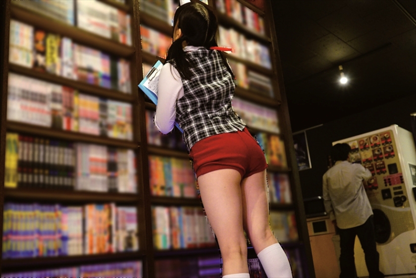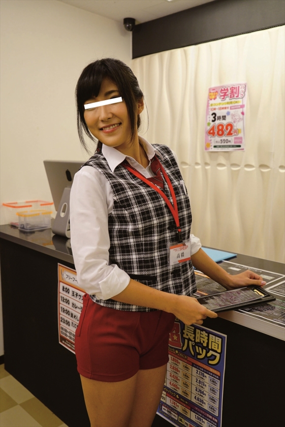 ブルマネットカフェ AV見放題のネットカフェの女店員さんのソソる制服はワイシャツにブルマ!ミスマッチな格好にムラムラしてしまい、AVと勃起チ○ポを見せつけてみると・・・